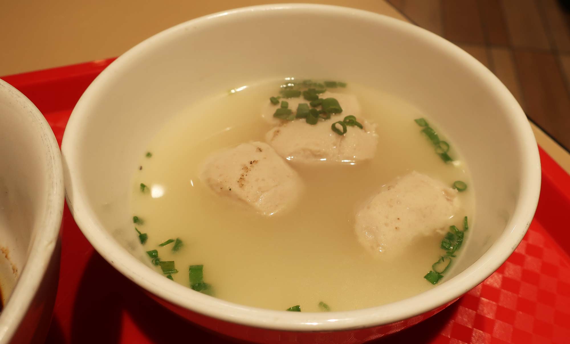 The meal comes with a bowl of pork noodles along with some pork ball soup.