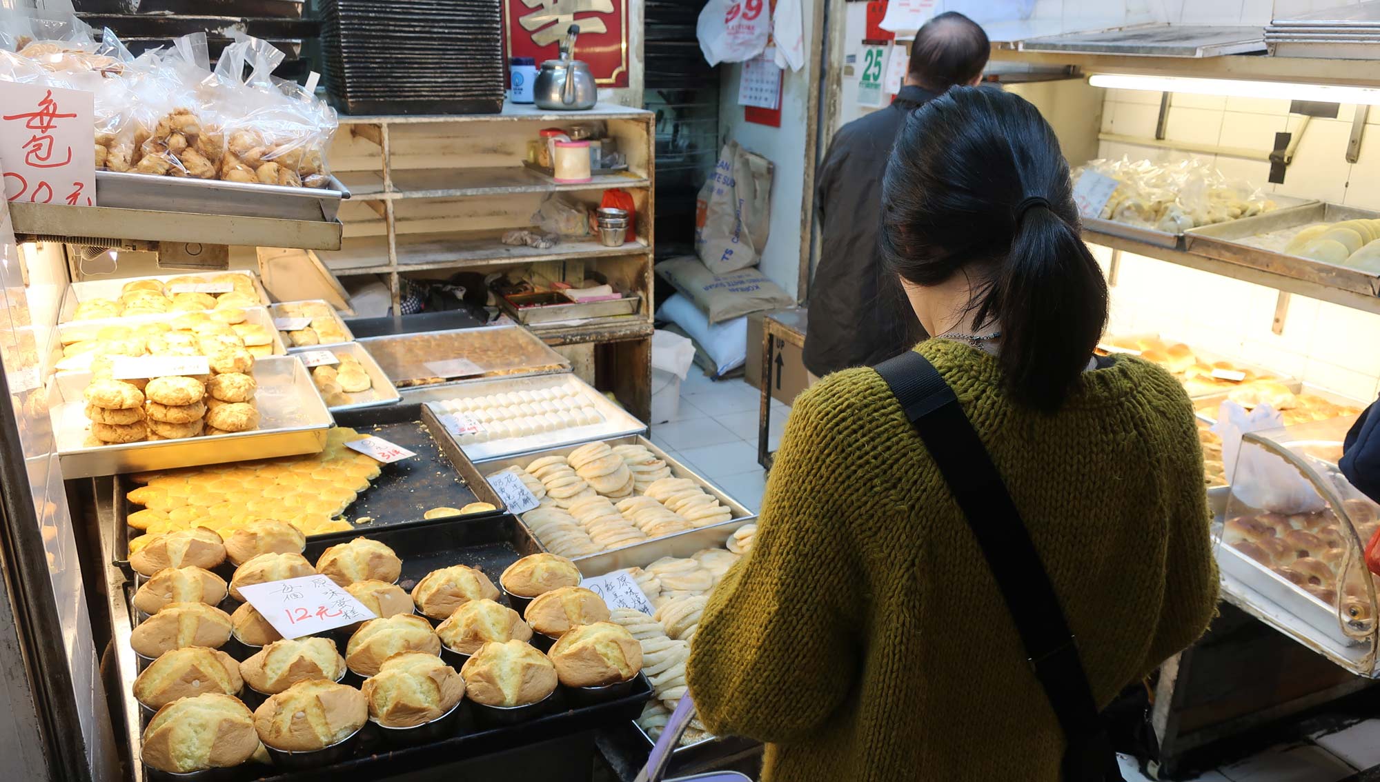 The Ming Wah Bakery in Mong Kok serves a bunch of tasty looking pastries, including a pineapple bun. The pineapple bun costs literally half of what the bun at Kam Wah costs (3.50 HKD versus 7 HKD) and is equally delicious.