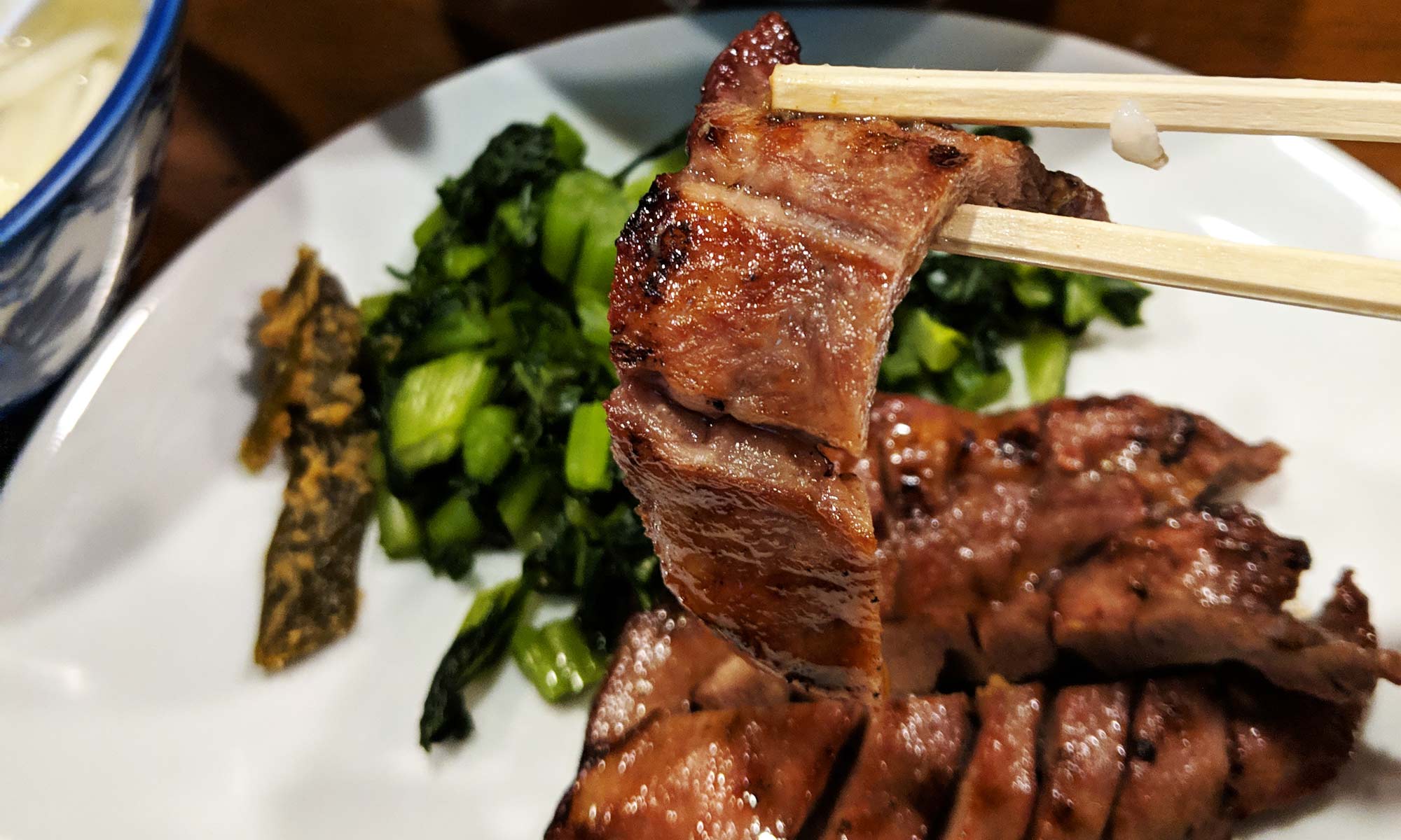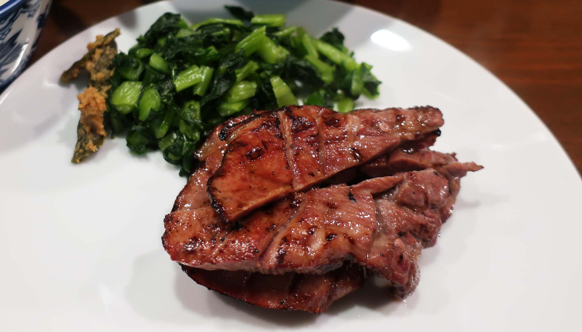 The tongue is delicious.  They cook it over hot coals, which gives it some nice char and an irresistibly smoky flavour.  It’s nicely seasoned, but the pronounced beefiness is clearly the star of the show.  And the texture is great — it’s nice and tender, but with a meaty bite.