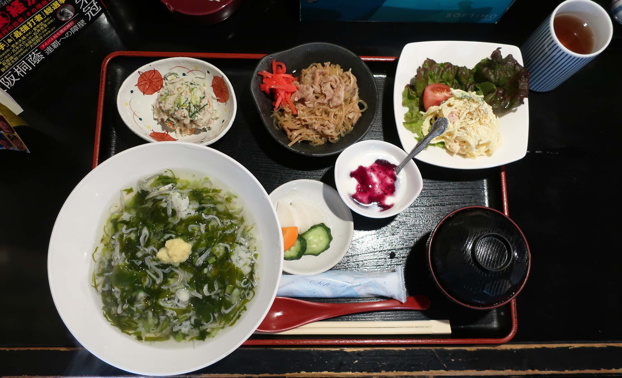 The other things on the tray, going clockwise from the main dish, are potato salad, thinly-sliced fatty pork with glass noodles, pasta salad, miso soup, pickles, and yogurt with a berry sauce.