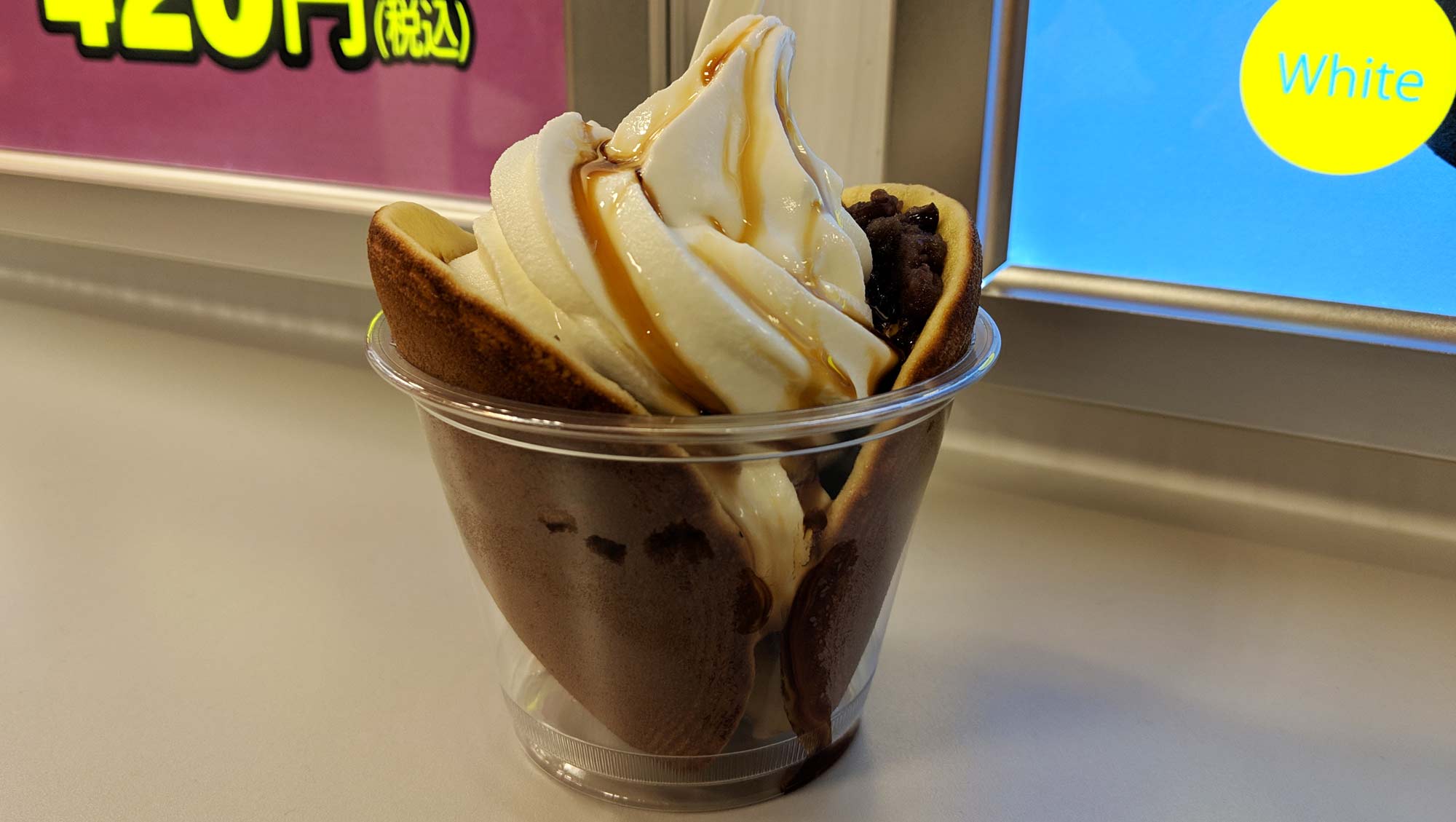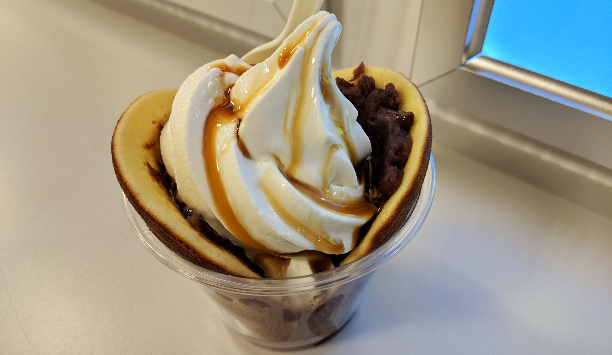 Dorayaki is a Japanese dessert that’s essentially a pancake sandwich with a sweet red bean filling.  Here, it’s served with soft serve ice cream and topped with a sweet syrup (pancake syrup, basically).
