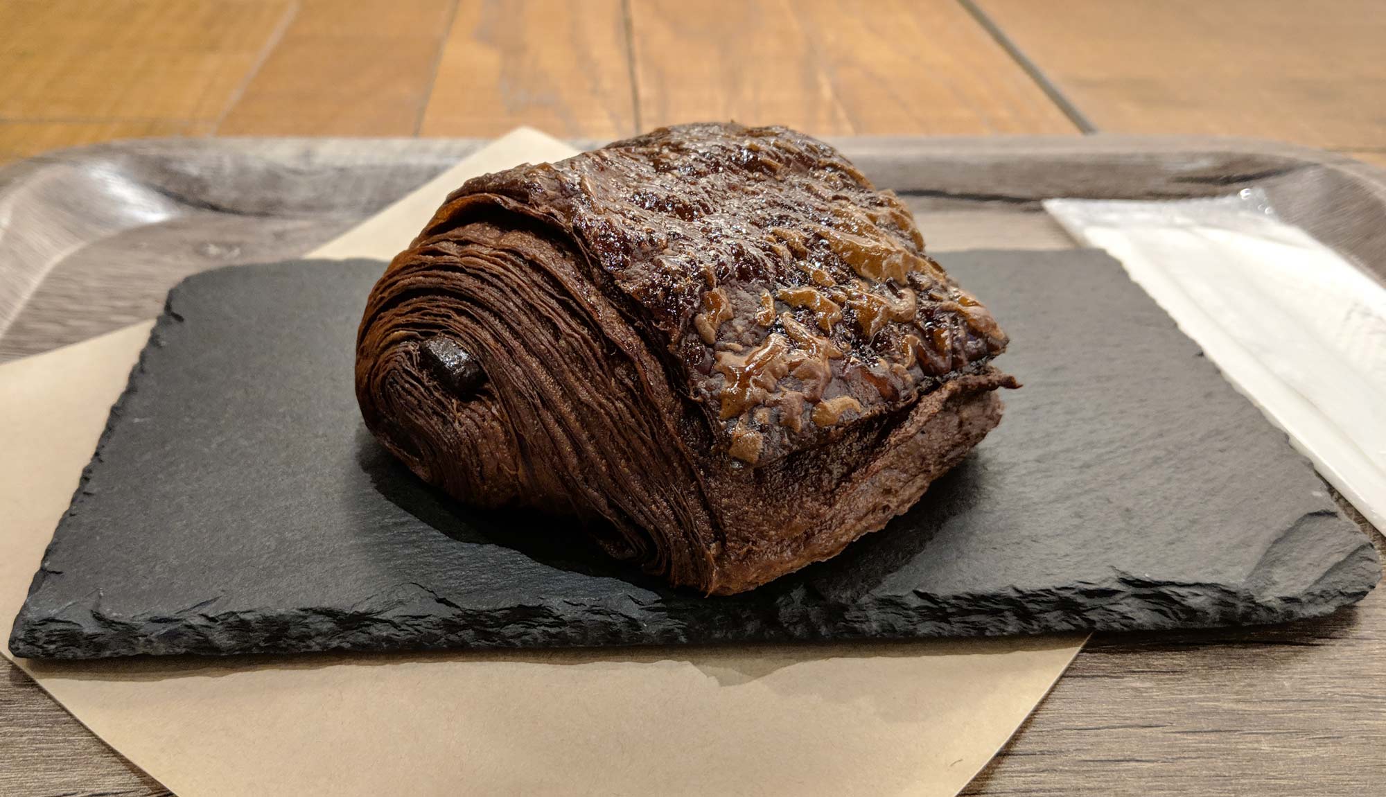The sweetness is remarkably restrained; there’s almost no sweetness from the pastry itself, only the chocolate and the light glaze.  Though the pastry looks dark and chocolatey, it tastes like a standard croissant with mild cocoa undertones.
