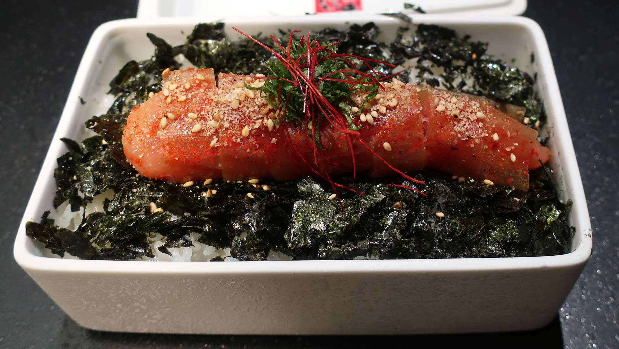 One of the local specialties here in Fukuoka is something called mentaiko — a reddish, sausagey-looking thing made from cured sacs of pollock roe.