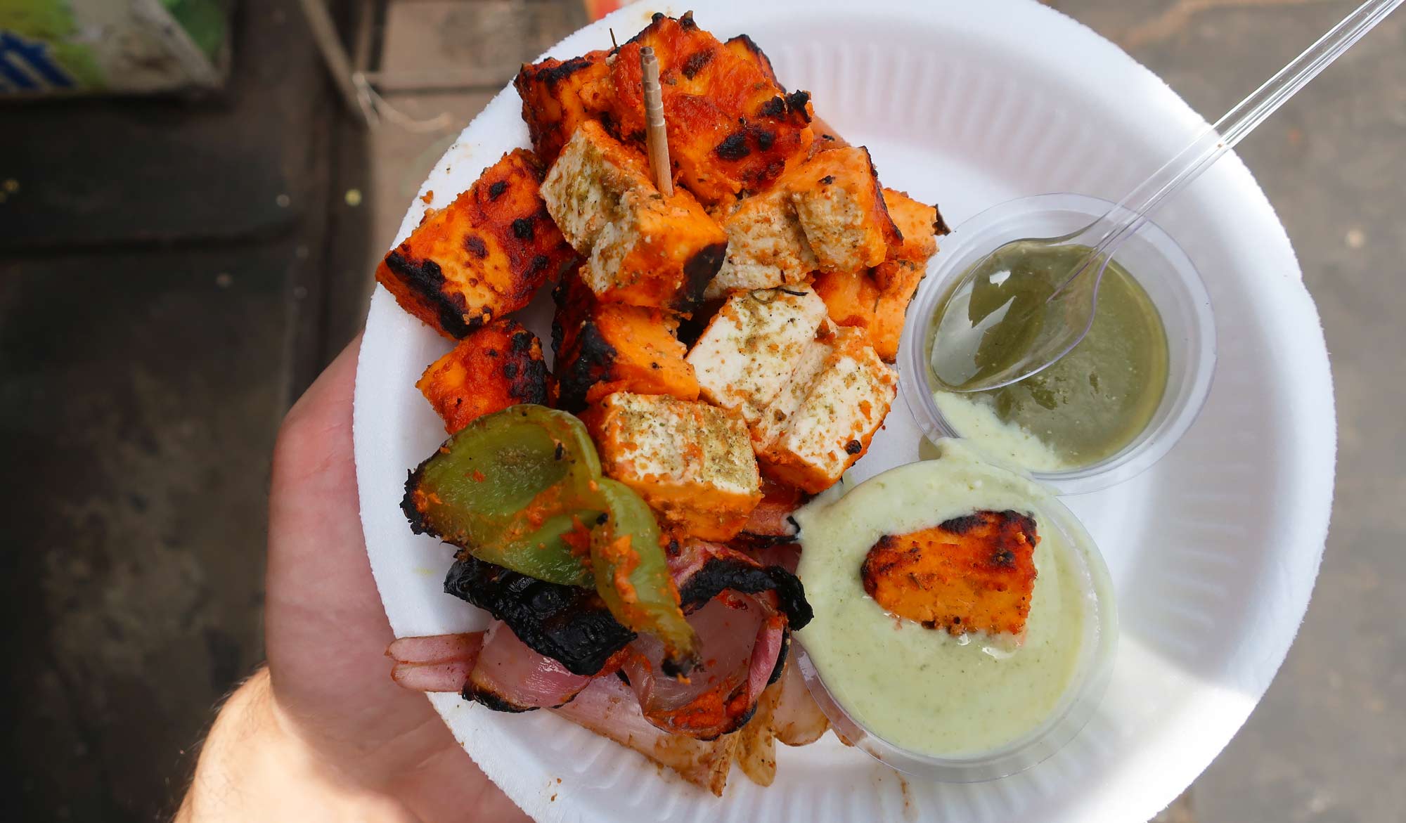 Paneer is a fresh, Indian cheese (it’s a bit cheese-curd-esque, only without that cheese’s gooey meltiness) that’s apparently pretty delicious when you grill it.  Because I just had the paneer tikka at Radhey Shyam Bhatia Paneer Wale, and it was extremely satisfying.