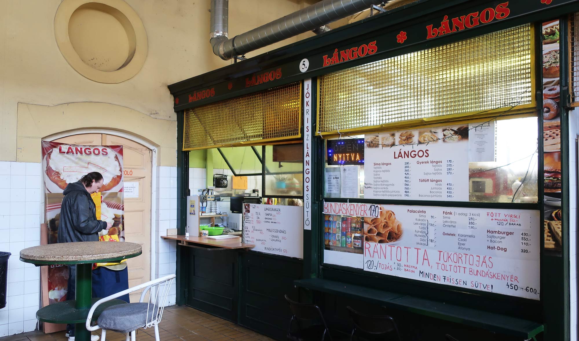 A vendor at the back of the Rákóczi Market Hall called JóKrisz Lángos Sütöde serves these things, and man, they’re good.