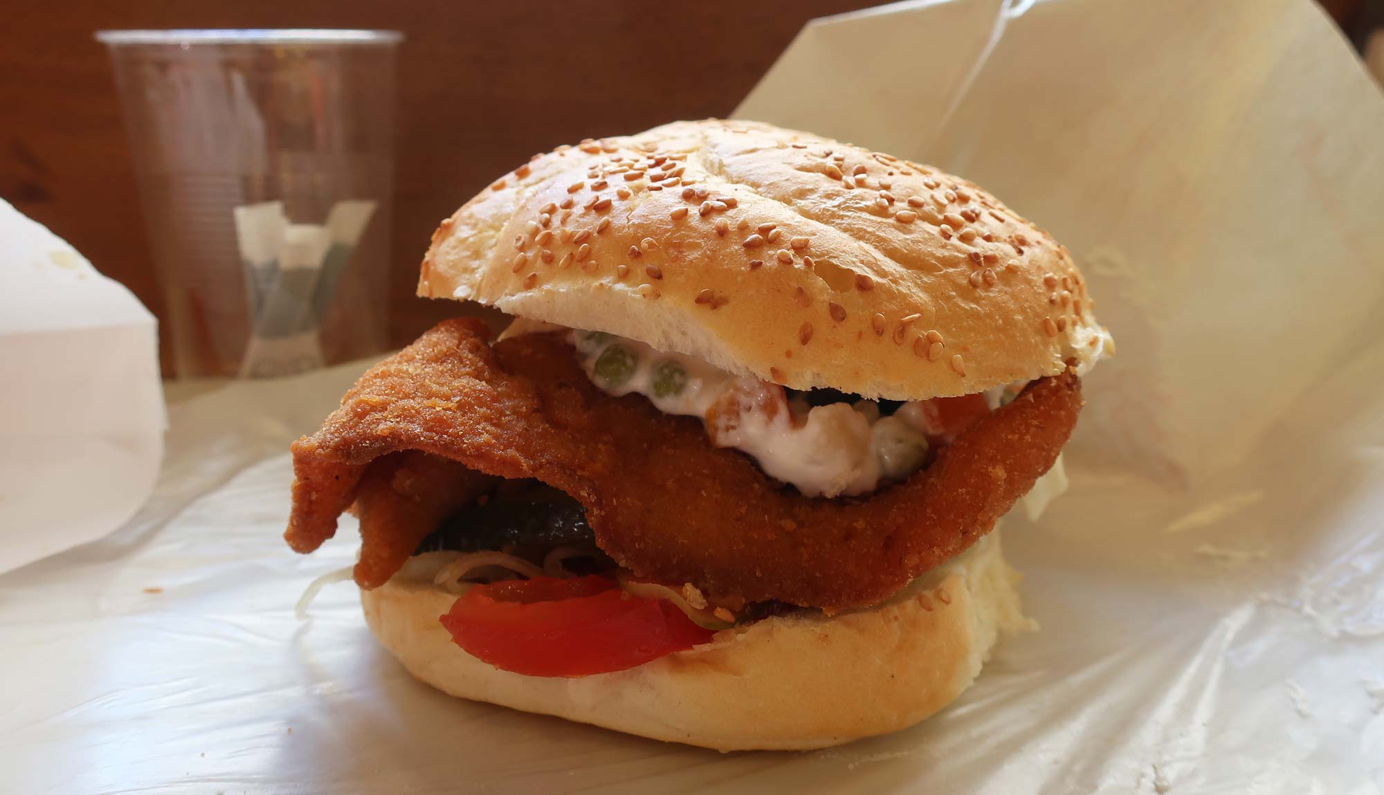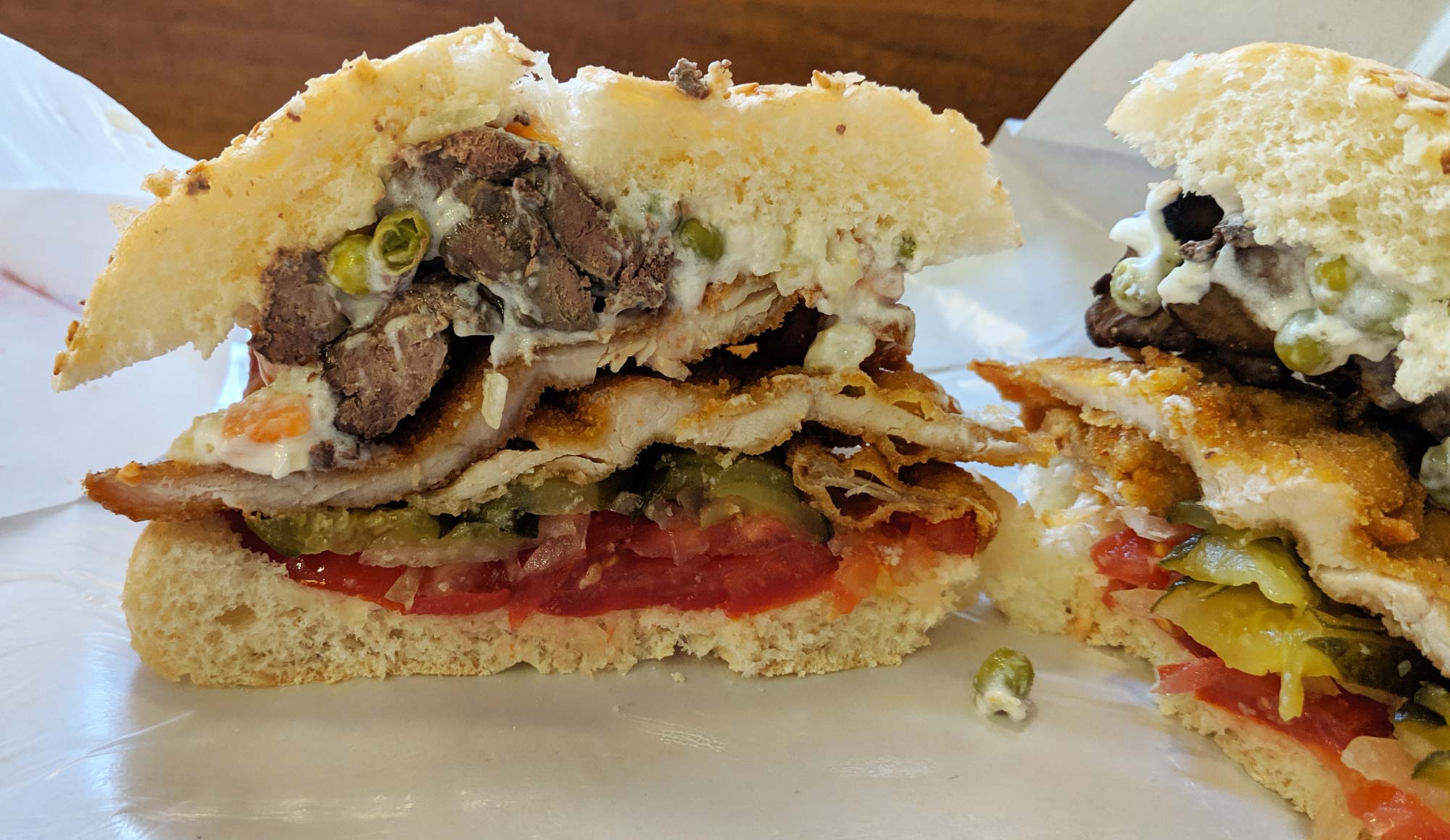 And Csirke Csibész serves an interesting one. Featuring fried chicken cutlets, grilled liver, potato salad, tomato, onion, and pickles, it’s absolutely crammed with tasty stuff.