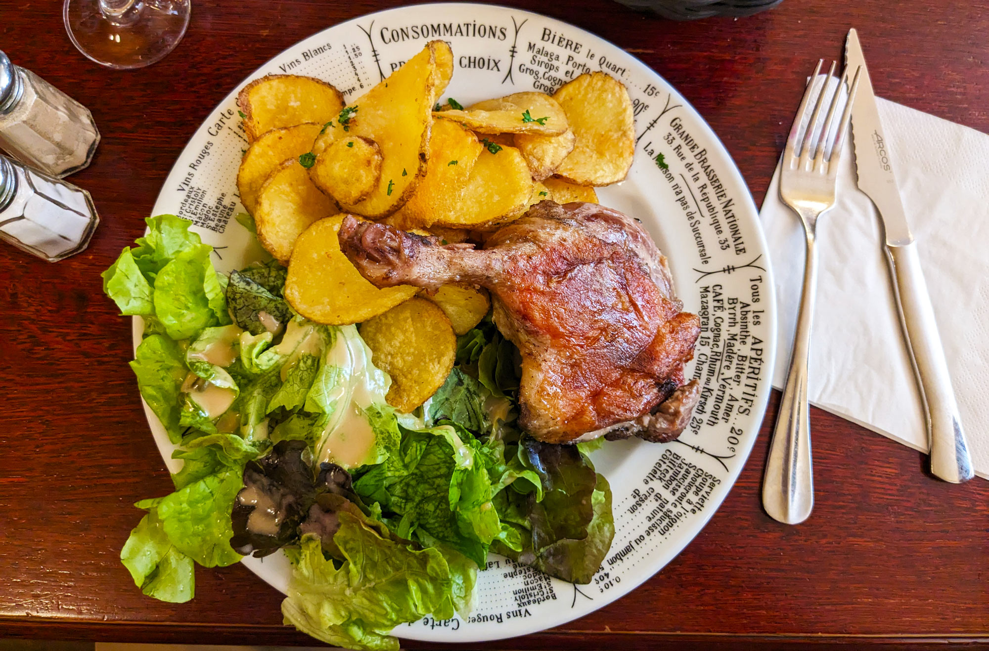 They serve an assortment of French bistro standards here (think: roast chicken, beef tartare, steak frites, etc.); I went with the duck confit, which comes with a salad and a side of sarladaise potatoes.