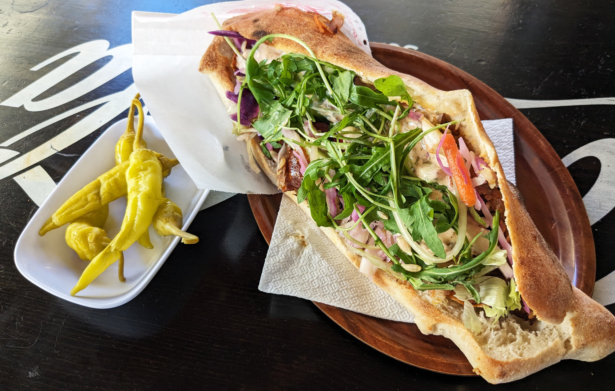 The sandwich was also maybe the biggest sandwich like this that I’ve ever had? I don’t think you really get a good sense of scale from the photo, but the thing was maybe like a foot long, and it was absolutely crammed with meat, which was nicely spiced, tender, and had plenty of crispy bits. My only complaint is that the sandwich isn’t spicy at all, but there’s a bucket of zingy pickled peppers you can help yourself to, along with a shaker of chili flakes on every table.